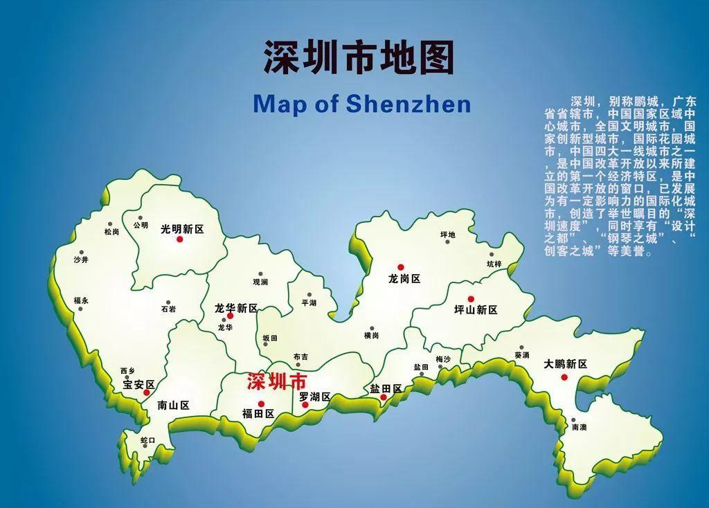 深圳最早的前身为广州宝安县,深圳之名始见史籍于明朝永乐八年,1979年成立深圳市,1980年成为中国设立的第一个经济特区,中国改革开放的窗口和新兴移民城市,创造了举世瞩目的“深圳速度”,被誉为“中国硅谷”