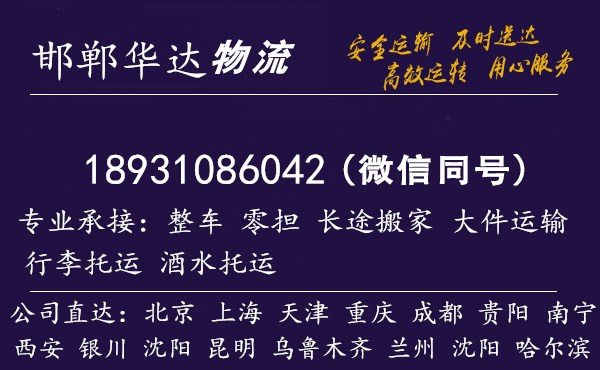邯郸到陇南物流公司 |邯郸物流公司 华达物流 电话0310-5510646手机18931086042专业提供邯郸到陇南物流专线运输、整车运输、零担运输、大件运输、长途搬家以及易碎物品整理装箱、家具电器拆卸打包等服务。10年物流运输经验,保证客户零风险,一站式综合邯郸到陇南物流服务,您值得信赖!