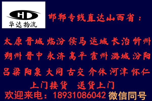 邯郸到侯马物流公司运费查询:18931086042华达物流以一流的服务体系,本着安全,准时,互友,互惠的原则赢得市场,只要一个电话,一切由我公司操办, 望广大新老客户给予大力支持、与我公司联络,我们将竭诚为您提供一切方便,欢迎来人来电咨询!